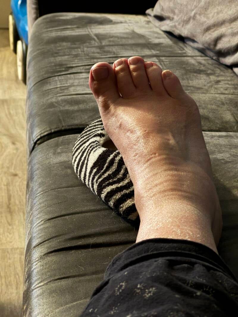Inmiddels waren mijn zolen klaar, ze waren te groot dus ik weer naar de podoloog. Jaja op slippers omdat ik inmiddels geen enkele schoen meer aan kon zo dik was mijn voet. De pijn nam ook al meer toe maar ik moest maar even doorbijten en toch op de zolen gaan lopen …. Maar jeetje hoe dan? Dit was onmogelijk dus de zolen belanden in de kast en ik blij dat ik mijn slippers nog niet weggegooid had.