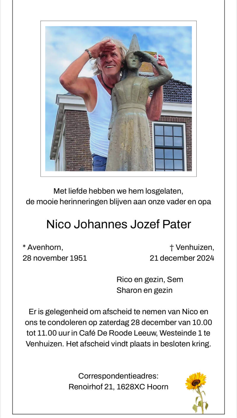 Zaterdag de 28e wordt ons Nico begraven bij de liefde van zijn leven, zijn Annetje die in 2000 na een kort ziekbed al is komen te overlijden. Het afscheid was prachtig, de hoeveelheid mensen die kwamen te condoleren was ongekend. Wel een mooie afspiegeling hoe geliefd Nico was. Sharon en ik hebben gesproken, jeetje wat was dat moeilijk, maar trots op mijzelf dat ik het heb gedaan.